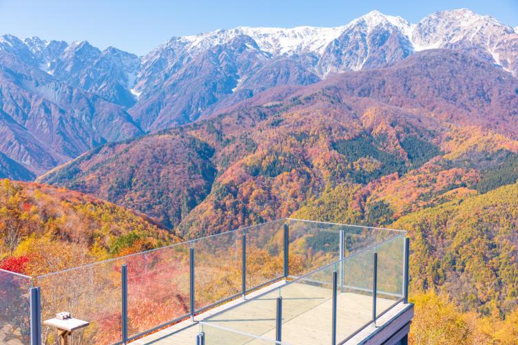 山頂の雪「白」、中腹の紅葉「赤」、ふもとの針葉樹林「緑」が美しい白馬三段紅葉をお楽しみいただけます。