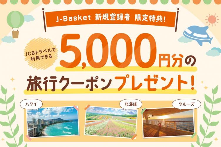 J-Basketに新規ご登録で、JCBトラベルで利用できる5,000円分の旅行クーポンをプレゼント♪