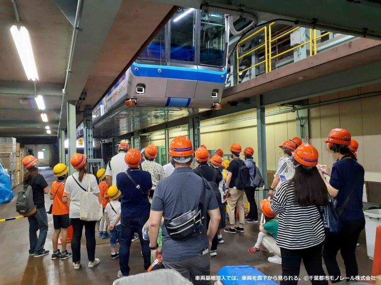今回は千葉都市モノレール株式会社の全面的な協力をいただき、ツアー専用の貸切列車と特別に萩台(はぎだい)車両基地内を見学。また、萩台車両基地ではモノレールの洗車シーンを外から見ていただき、車両基地内を下から上まで見学していただきます。