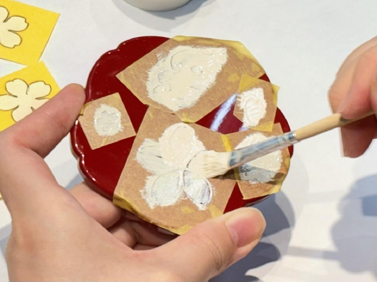 蒔絵とは漆器に漆で絵付けをする日本独自の技術です。好きな図柄のシールを器に貼り、塗料を筆で塗っていきます。