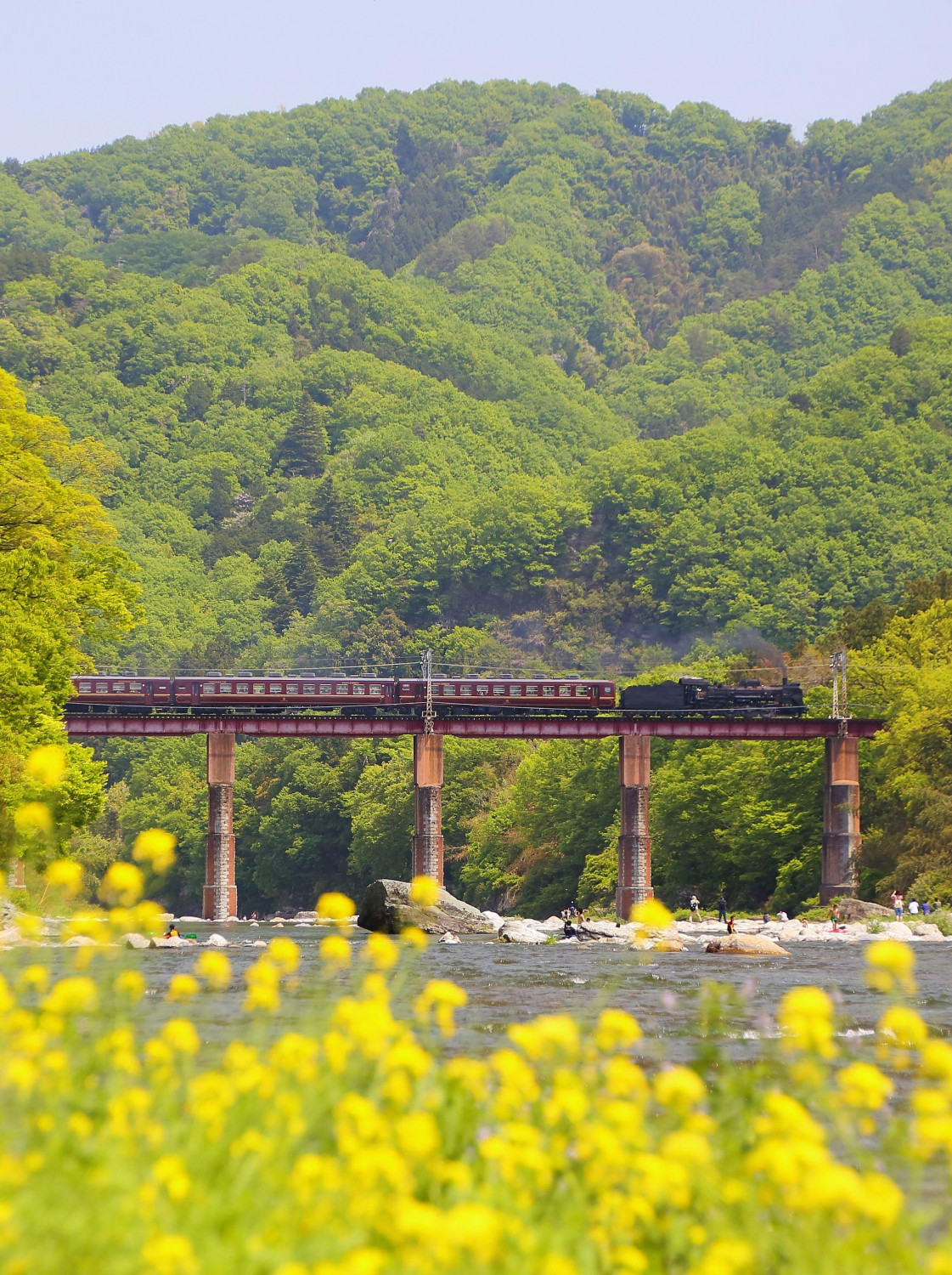 「SLパレオエクスプレス」の車窓から眺める荒川と、秩父の山々の雄大な景色は格別である(写真)。煉瓦といえば、渋沢が故郷の深谷市に設立した日本煉瓦製造の製品が有名だ。確証はないものの、荒川橋梁にも日本煉瓦製造の煉瓦が用いられた可能性が高いと考えられている。