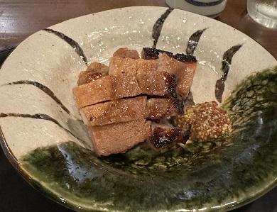 御所坊は神戸の旅館で唯一、明石浦漁港への出入りを許されている宿で、料理長自ら魚を厳選して仕入れています。この日のお造りは、炭火で皮目を炙って仕上げたもの(写真)。炭の焼き場が目の前にあり、メインの「兵庫産豚肉の炭火焼き」(写真)は表面がパリッと芳しく、噛みしめると、じんわりとうまみが広がります。飼料や飼育方法にこだわった稀少な牛肉「但馬玄(たじまぐろ)」のコースもおすすめです。