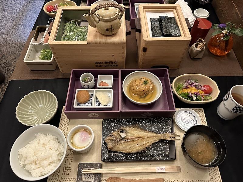 御所坊の朝食(写真)は、とても豊かな気持ちになります。白い湯気があがっている丹波黒豆の湯豆腐に、削りたての鰹節をのせて味わうと豆のコクと甘みが口いっぱいに広がります。地元須磨浦沖の焼きのりは豆炭で温められていてパリパリ。兵庫県の農家が育てた有機栽培米のごはんと一緒にしみじみと味わう、幸せな朝食です。