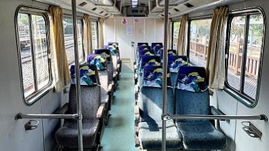 嘉義車站(以下、駅)の駅舎は重厚な風格をまとっている。列車は構内の片隅から出発する。阿里山鉄道のレールの幅(軌間)は762ミリメートルで、「ナローゲージ」と呼ばれる。車両(写真)も小さくて、高さは2メートルあまり。片側1席+2席の座席配置で、1両あたりの定員は多くても25名である。