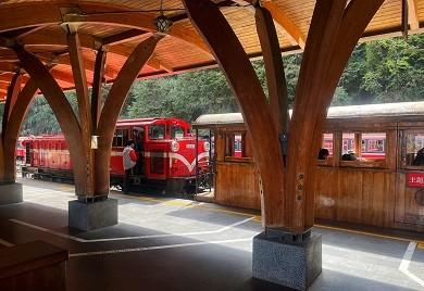 二萬平(にまんだいら)駅から先は杉林が広がる。標高2138メートルの神木(しんぼく)駅でもスイッチバックで進行方向を変え、列車は最後の急勾配区間に入った。視界が開けると、いよいよ阿里山駅(写真)に到着だ。