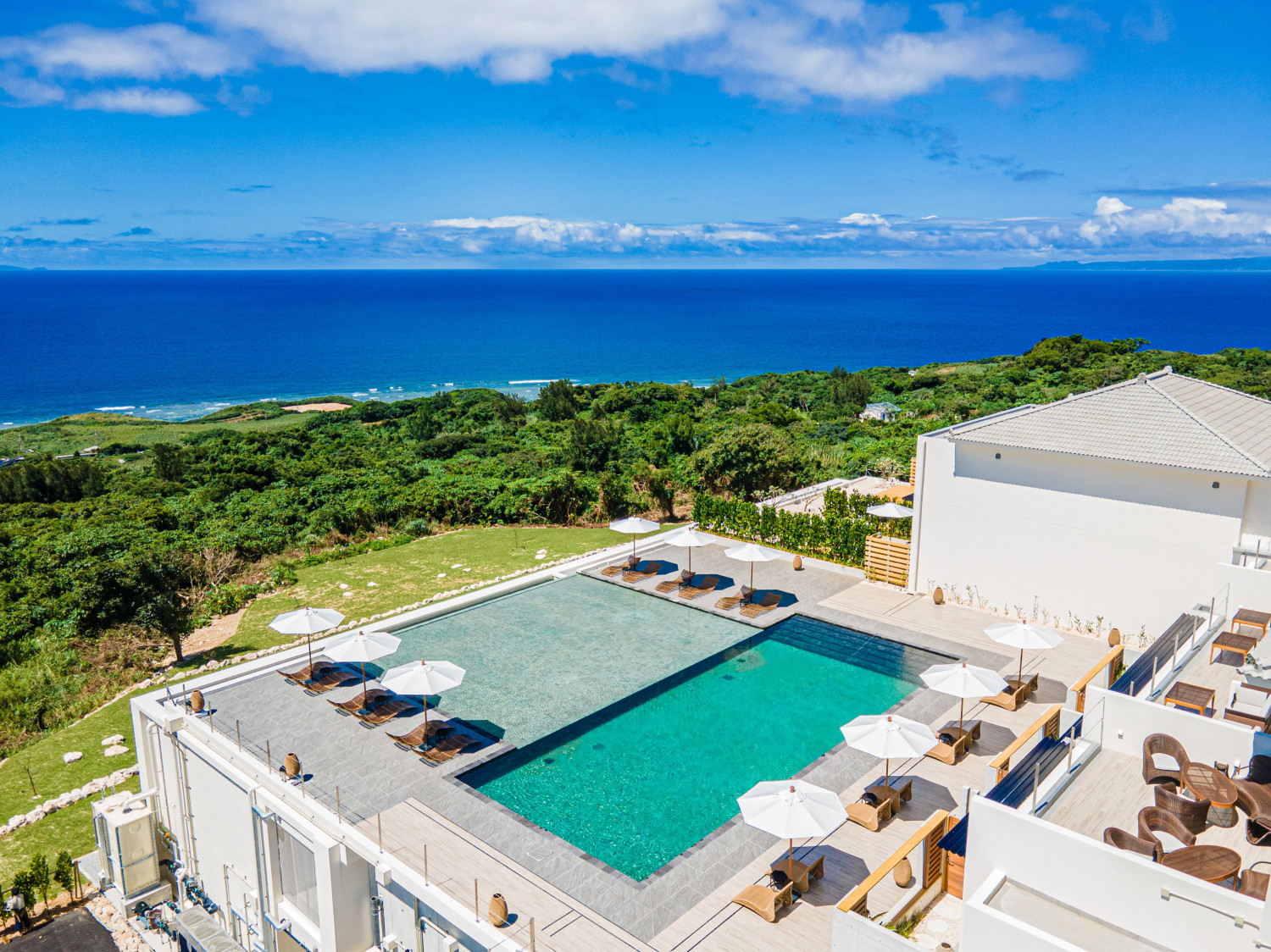 本誌で紹介したホテル「One Suite THE GRAND」は島のほぼ最高地点、海抜100mほどのところにある。遠くまで見渡せるのと同時に、海の色を間近に楽しむことができる絶好の立地だ。まずはインフィニティプールで開放的なひとときを。空と海に溶け込むように計算された配置で、プールの水が海に流れ込んでいくような錯覚に陥ってしまうかもしれない。