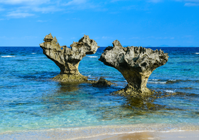 古宇利島は周囲約7.9㎞と、自転車でぐるっと回れる大きさだ。見る場所によって変わる海の色を楽しみに、気軽に出かけてみたい。ぜひ砂浜まで降りてほしいのが、ティーヌ浜。ハートロックと呼ばれる岩が、にょきっと海から生えるように立っている。航空会社のテレビCMで有名になり、恋人たちの聖地ともいわれている。このハート岩の前で写真を撮るためだけに那覇から日帰りでくる人も多いそう。天候に恵まれれば、昼、日没時でそれぞれに絶景を写真に収められる。