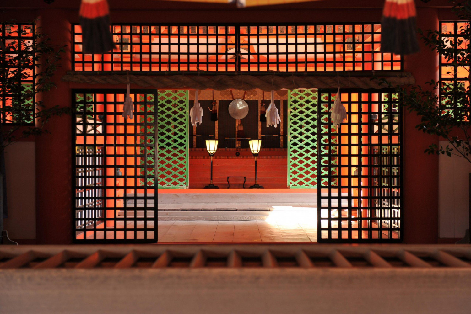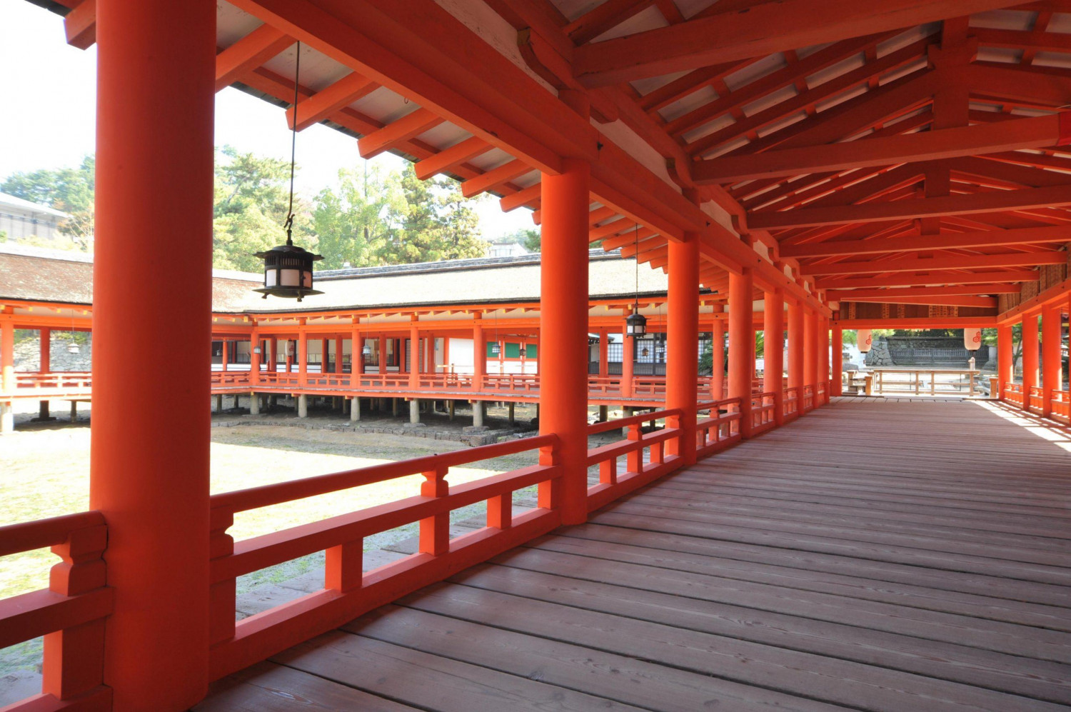 標高535mの弥山(みせん)を背景に、御笠浜(みかさのはま)に建てられた社殿は平安貴族の住宅様式である寝殿造りを取り入れたもの(写真)。海側から見ると、高さ約16mの大鳥居の先に三女神を祭る御本社と、摂社(御祭神とゆかりの深い神を祭る神社)である客(まろうど)神社が立ち、いずれの神社も本殿、幣殿、拝殿、祓(はらい)殿がある。本社を中心に、客神社、大国(だいこく)神社、天神社、反橋(そりばし)や能舞台など、社殿を結ぶ廻廊(写真)の長さは東西合わせて約260m。干潮時には大鳥居まで陸続きになるが、1日2回、潮が満ちると大鳥居や廻廊で結ばれた朱塗の社殿が海に浮かんだような幻想的な表情を見せ、“極楽浄土”を思わせる壮麗な空間が出現する。青い空と海に映える鮮やかな朱塗の社殿、黄金色に染まる夕方に、海上に浮かびあがる大鳥居など、自然と人工物である建築が織りなす景観は、潮の満ち引きに加え、天気や時間帯によっても刻々と表情を変える。