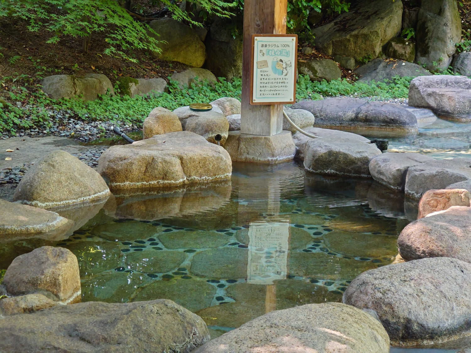 内風呂から庭園大露天風呂(冒頭写真)へはトンネルを通って向かいます。緑いっぱいの庭園のなかにある開放的な岩風呂です。大きな湯船は加温した温かな温泉、こちらに入って少し汗がにじんできたら、小さい湯船の冷たい温泉(写真)へ。約26度の源泉100%かけ流しで、最初は冷たいと感じますが、入ってしまえばパラダイス。ひんやりとした湯の感触がたまらなく心地よくて「夏こそ冷たい温泉ですね」なんて言いたくなります。ふたつの湯船を行ったり来たりしながら「温冷交互浴」をすることで、血行を促進させて夏の疲れを吹き飛ばしましょう。