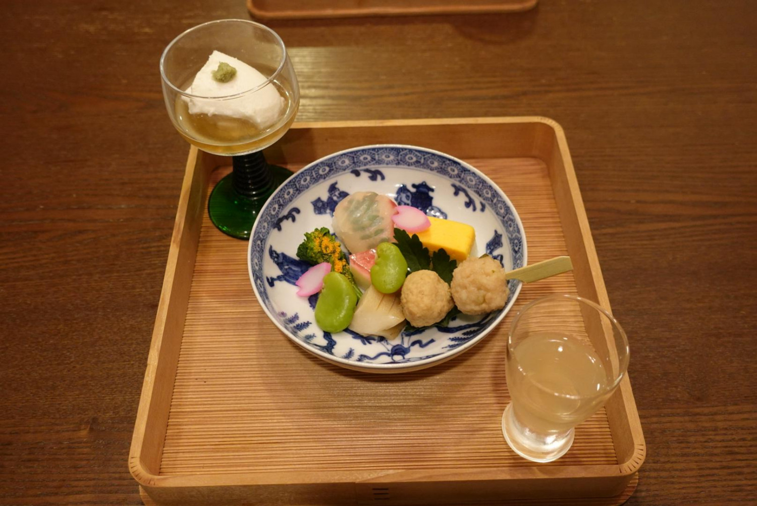 この宿で供されるのは、五頭の季節を愛でた料理です。桜の季節に行ったときの前菜は桜鯛の昆布締めを使った手毬寿司をはじめタケノコや鶏つくね、鮑のしんじょを花見だんごに見立てた「花見串」など(写真)。左上は宿の名物料理のひとつ「五頭山麓牛乳豆腐」です。地元安田地区の新鮮な牛乳で作る豆腐は、もっちりとした食感とクリーミーな味わいがモッツァレラチーズのようでもあり、口に入れるとふわっと溶けてゆく食感が豆腐のようでもあり、なんともいえずおいしいのです。