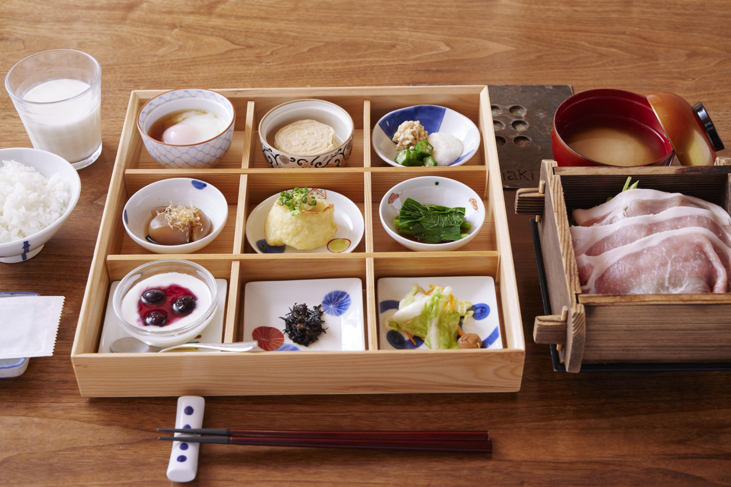 朝食(写真)は、とちぎゆめポークと地元野菜のせいろ蒸し、自家製がんもどきや近隣のハーレー牧場の牛乳、那須産の温泉たまご、那須産コシヒカリのごはんなど、地元食材を使い、栄養バランスもよく、体が整うごはんです。