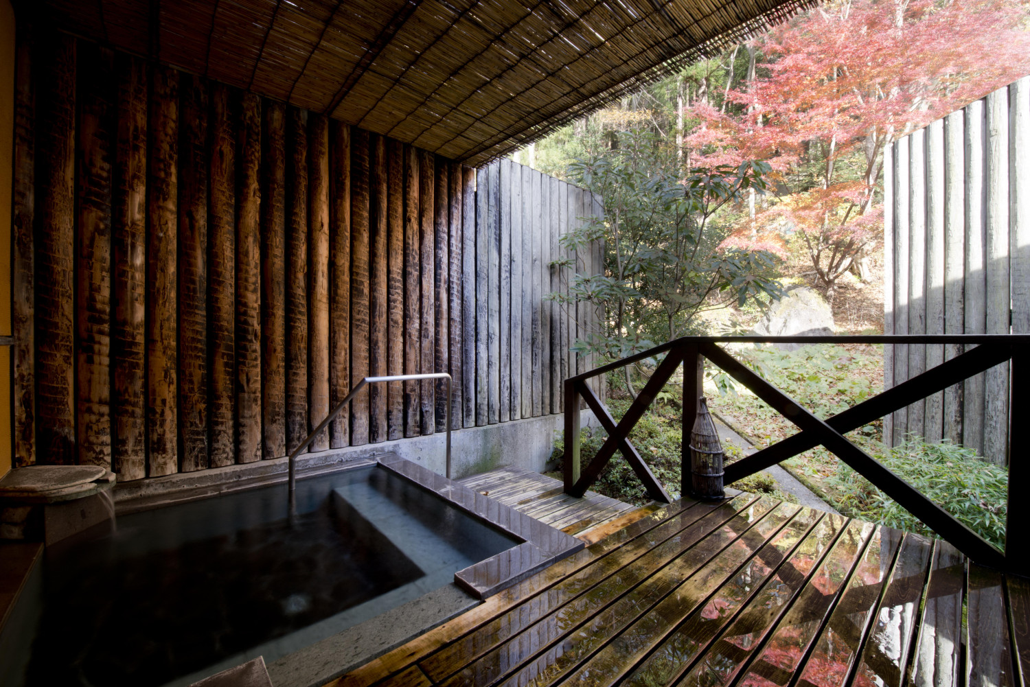 す。綱の下の湯船は90 cmくらいの深さで立って入ることができます。両手で綱につかまって入ってみると、ふわふわと宙に浮いているような感覚。絶妙な位置に結び目があり、そこにつかまれば全身が伸びて気持ちがよい。肩甲骨周りの筋肉が緩み、肩や首のコリが楽になってくる気がします。この不思議な気持ちよさにハマって、すっかりリラックスしていました。また、露天風呂もあり、秋には紅葉する木々を眺めながら静かな時間を過ごせます(写真)。