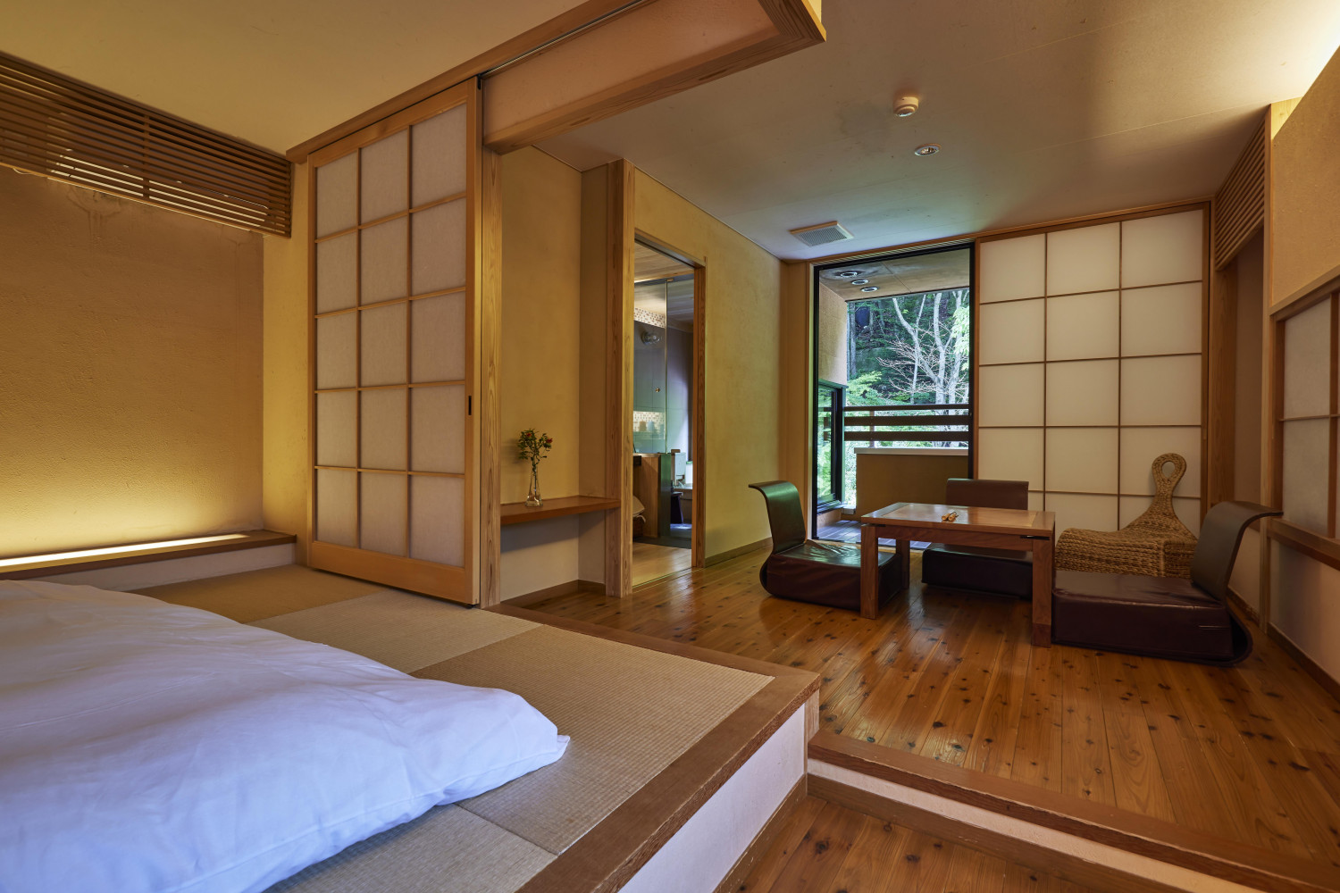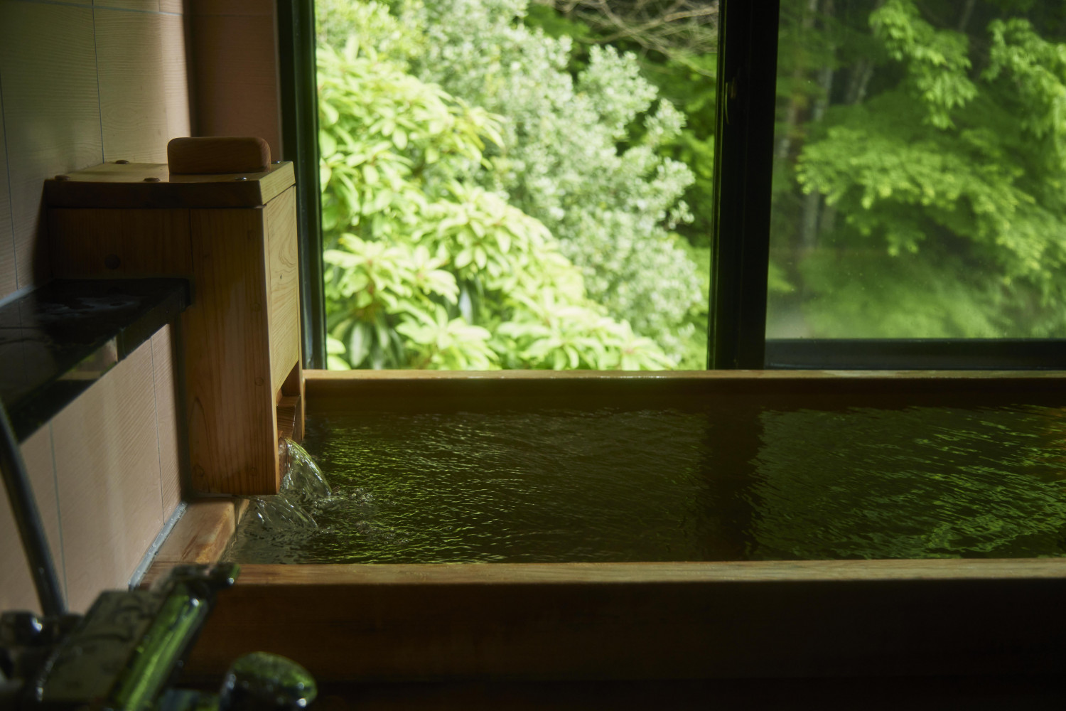 客室は少しずつ造りが異なっているので、どの部屋にしようか考えるのも楽しいものです。温泉付きの部屋(写真)もふたつあり、床、天井、湯船すべてが檜造りです。朝起きたら、布団から数歩で入れる温泉があるというのは至福です。温泉から森を眺めれば、ゆっくりと体の細胞が目覚めていきます。