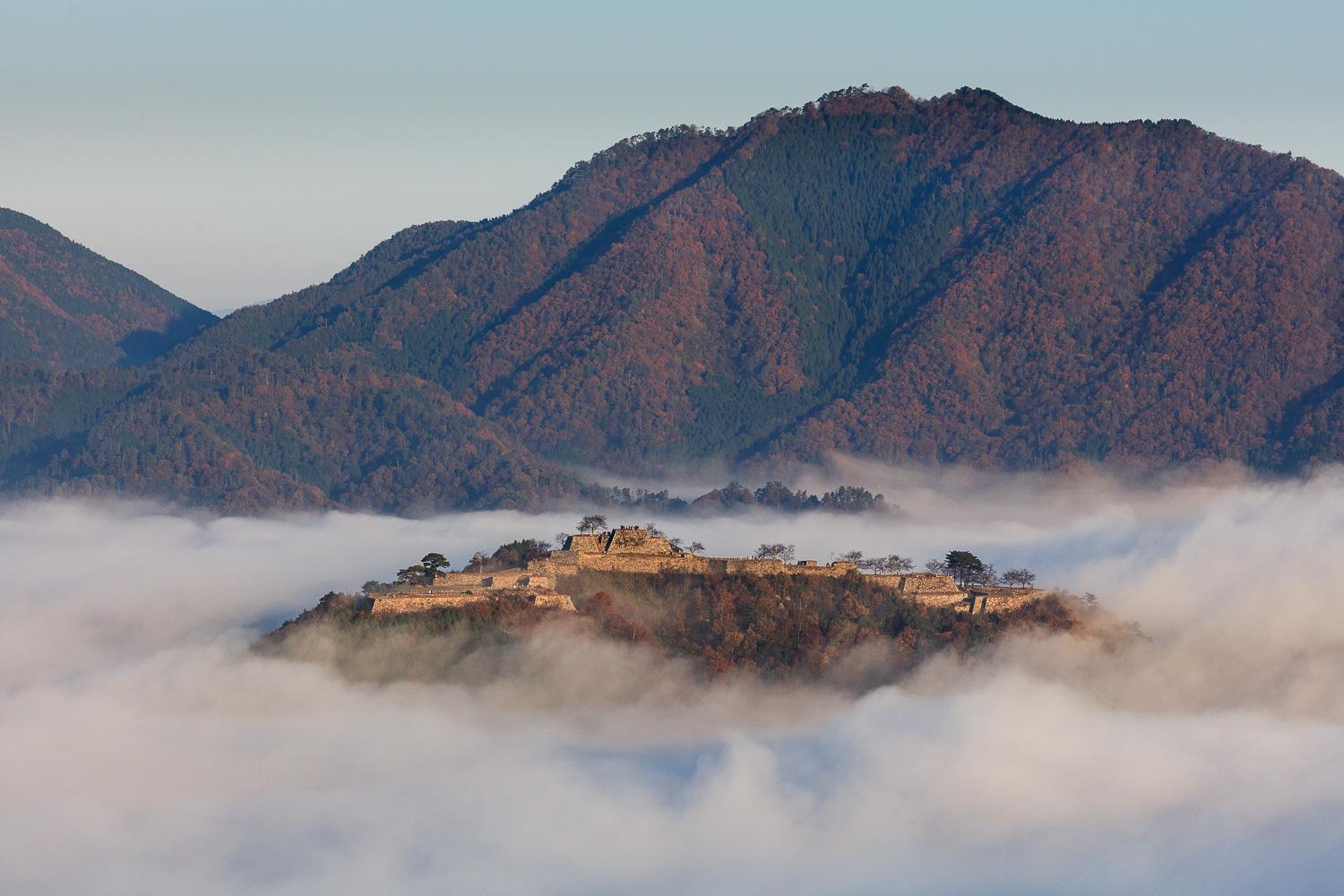 秋の早朝、古城山山頂に神秘的な世界が開けてくる。夜明け前の張りつめた空間に、まるで空に浮かんでいるかのように、竹田城を雲海が取り巻くのだ(写真)。雲海の正体は、城の東側を流れる円山(まるやま)川から発生する朝霧。雲ひとつない晴天の日、夜間にぐっと気温が下がると、発生率が高まる。日中に温められた空気が夜になって冷やされ、水温よりも低くなったとき、川面から水蒸気が発生して霧となり立ち上る。