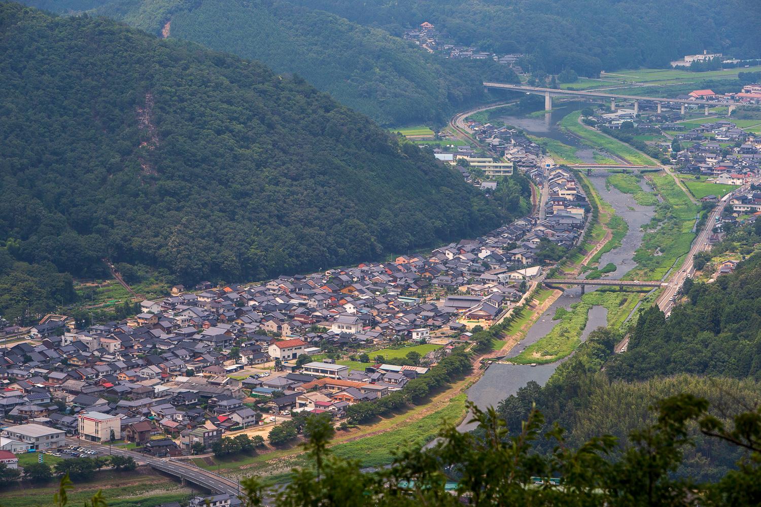 竹田城の始まりは、但馬(たじま)(兵庫県北部)守護の山名氏と播磨(はりま)(兵庫県南西部)守護の赤松氏の衝突がきっかけ。この地は、但馬、播磨、丹波(たんば)(京都府中部、兵庫県北東部、大阪府北部)の交通の要衝。播磨の姫路から但馬・丹波方面へ北上する街道と、但馬・丹波の2国を縦断する街道の交差点にある(写真は上空から見た城下町。左手が竹田城のある古城山)。竹田城からは丹波との国境が見え、鳥取方面に通じる街道も見渡せる。