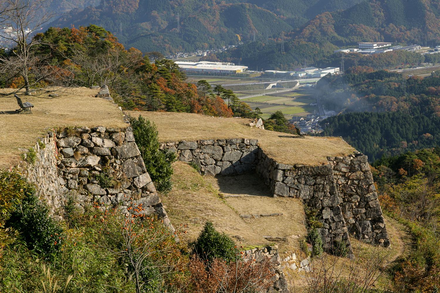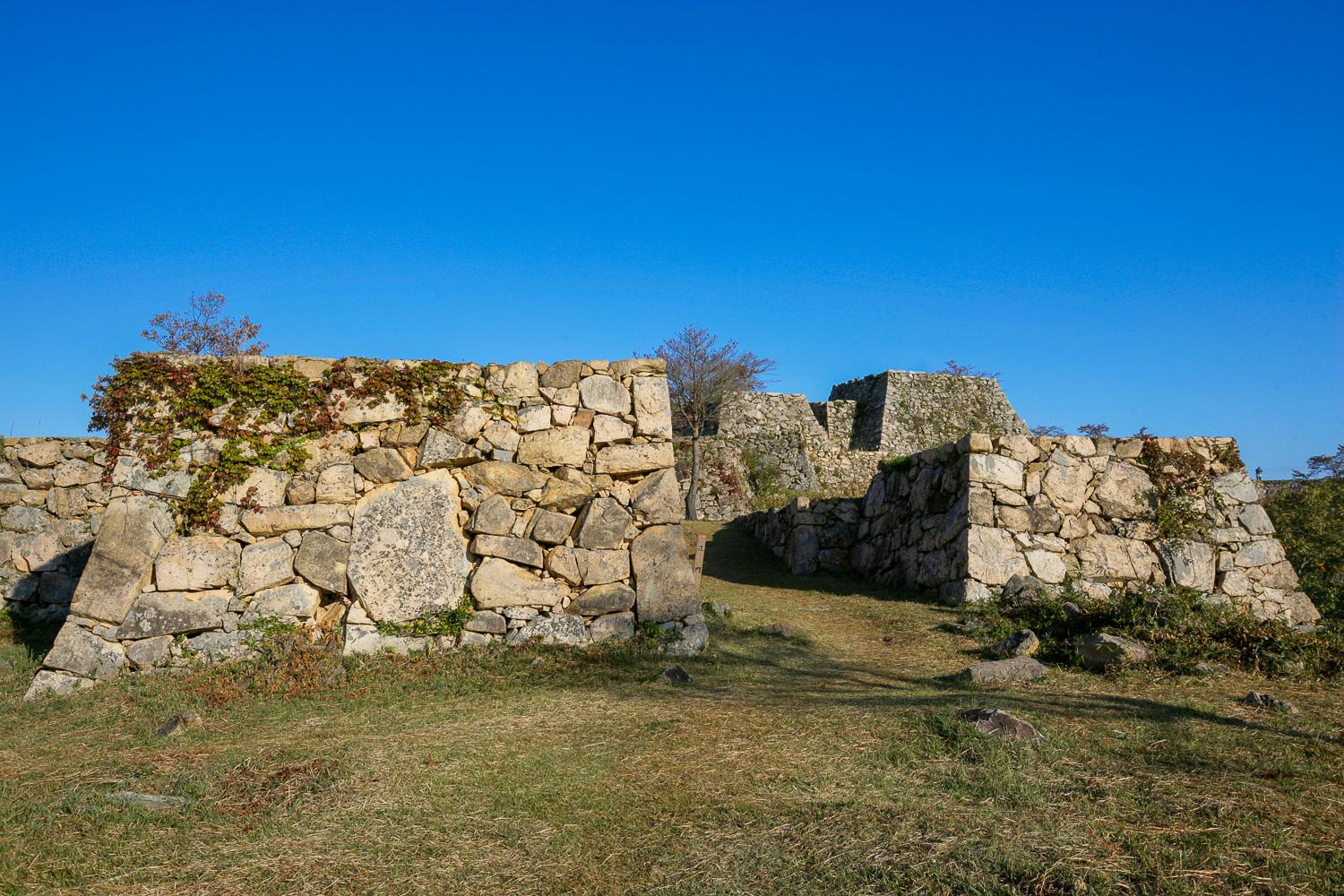 また、縄張(設計)の特徴からも、秀吉との関わりが推察できる。枡形虎口(ますがたこぐち)(写真)や喰違(くいちがい)虎口を多用し、くまなく横矢がかけられた技巧的な設計は、織田・豊臣系の城の特徴といえる。山頂の天守台(写真)を中心に、三方向に向けて尾根上に曲輪(くるわ)が段層的に広がり、要所に櫓(やぐら)台を配置。周囲に堀切や竪堀(たてぼり)などの防備装置を効率的に置いて防御性を高めている。