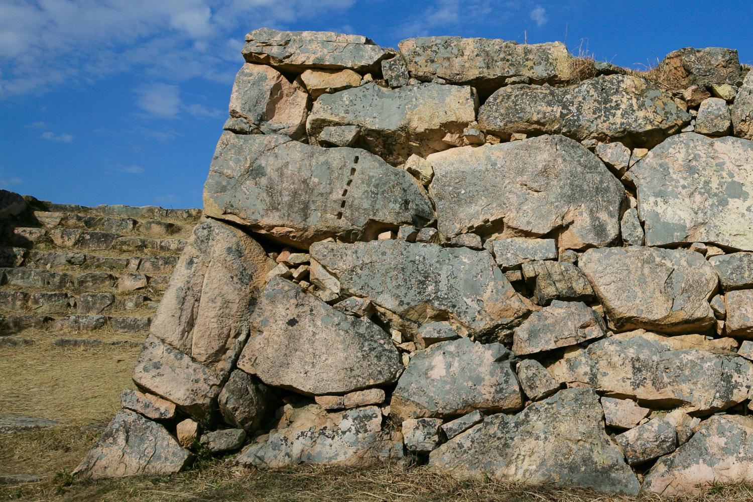 もちろん近年に修復された石垣もあるが、その存在感にはきっと圧倒されることだろう。大小さまざまな石材を組み合わせて積んだ野面(のづら)積みの石垣をはじめ、城内の石垣(写真)は独特の美がある。未発達な隅角部の「算木(さんぎ)積み」(写真)も古めかしく味がある。その趣を存分に感じてみてほしい。