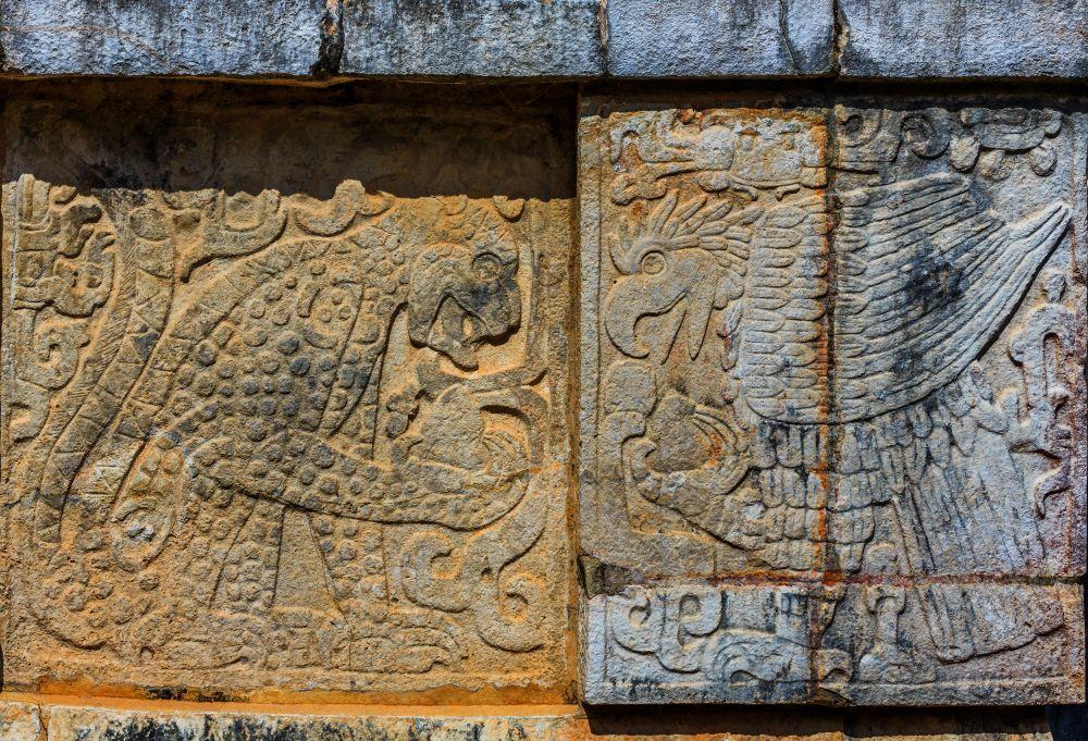 メキシコから中央アメリカにかけては、15世紀末にコロンブスがアメリカ大陸に到達し、スペインが植民地化を始めるよりもはるか昔から、マヤ、アステカ、テオティワカンなどのメソアメリカ文明が開花していた。エジプト文明など大河流域に発展した文明が多いなか、メソアメリカでは、川から離れた地に古代都市の数々が築かれた。そのひとつ「チチェン-イッツァ」(写真は遺跡内に見られるレリーフ)は、ふたつの時代に栄えた都市だ。