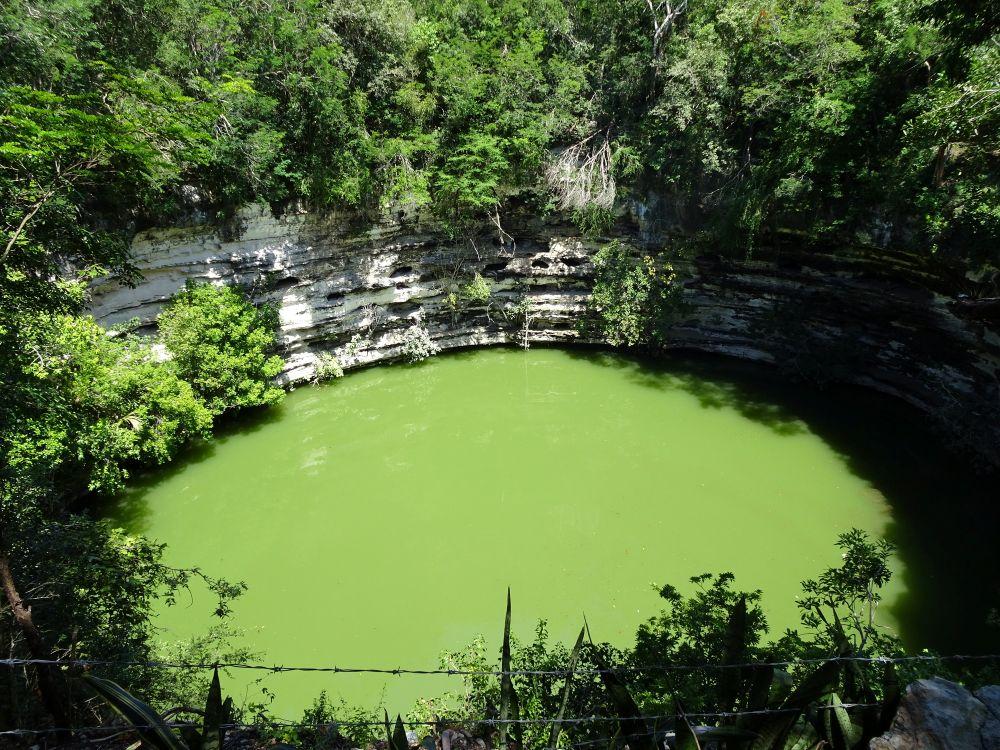 チチェン-イッツァとは、マヤの言葉で「聖なる泉のほとりの水の魔術師」を意味する。ユカタン半島にはセノーテ(天然の井戸や泉)(写真)が数多く存在するが、チチェン-イッツァは半島最大のセノーテを中心に繁栄。450年ごろからマヤの一派・イッツァ族が都市を築き、7世紀には最盛期を迎えたものの、王族はこの地を去った。11世紀ごろから12世紀末ごろ、同じくメソアメリカ文明のひとつであるトルテカ文明の影響を受けた都市として復興したが、その後再び、歴史の表舞台から姿を消した。