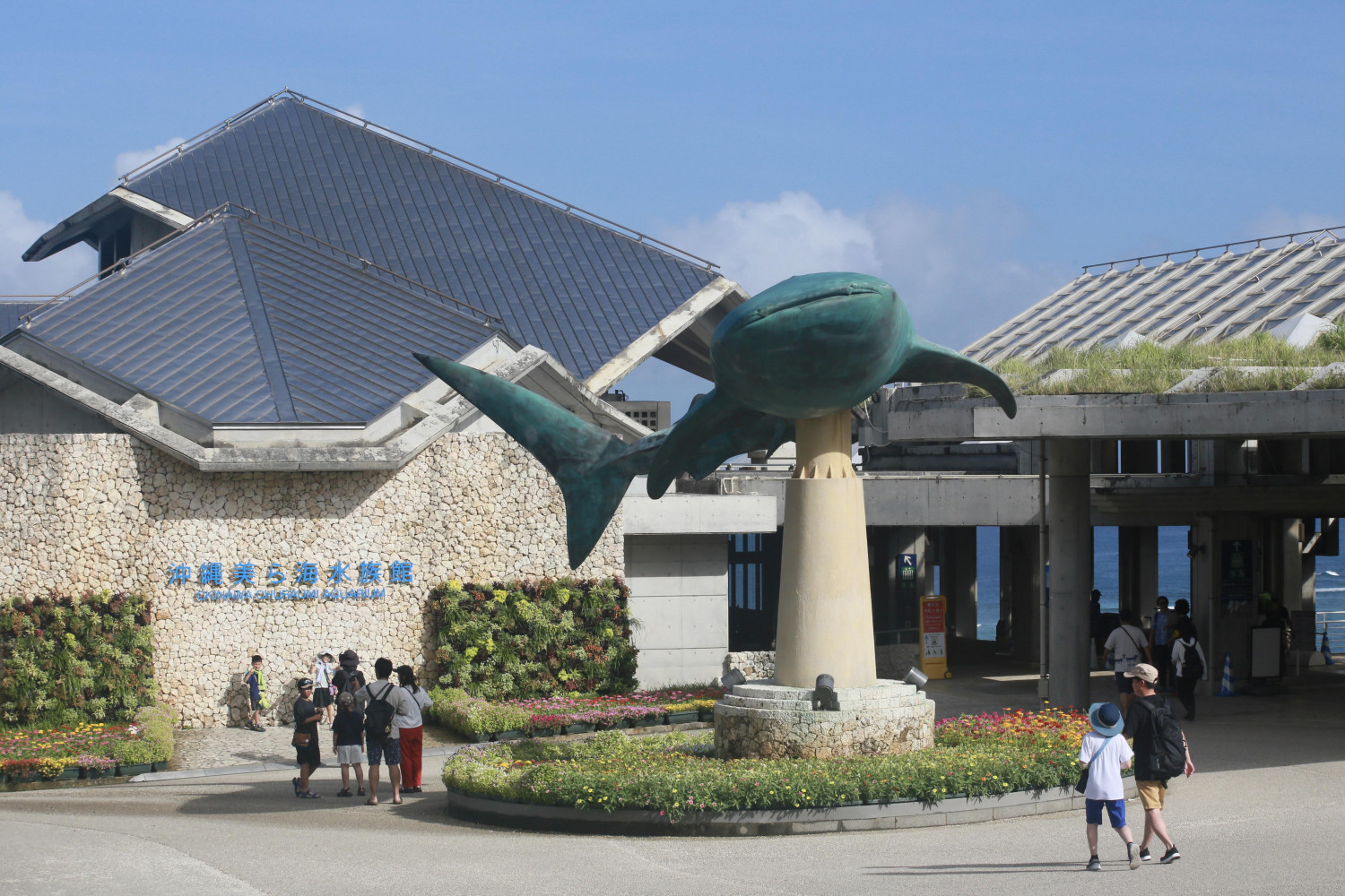 巨大なジンベエザメのモニュメントが迎えてくれる「沖縄美ら海水族館」(写真)。モニュメントを通り過ぎ、4階の「海人門(ウミンチュゲート)」から3階へ下って入口へ。ここから、海を潜っていくように1階まで見学していくと、雄大な沖縄の海を探検した気分になるように構成されている。