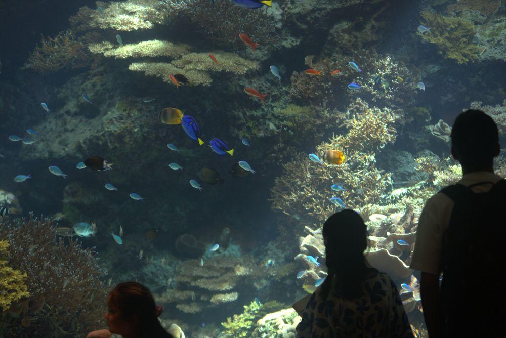 3階「サンゴ礁への旅」で最初に出会うのは、沖縄でイノーと呼ばれるサンゴ礁に囲まれた浅い海。そこから、多様なサンゴが見られる「サンゴの海」、カラフルで形もさまざまな魚が泳ぐ「熱帯魚の海」(写真)へと続く。日差しが降り注ぐなか、自由に舞い泳ぐ熱帯魚の海のにぎわいぶりに、つい釘付けになる。
