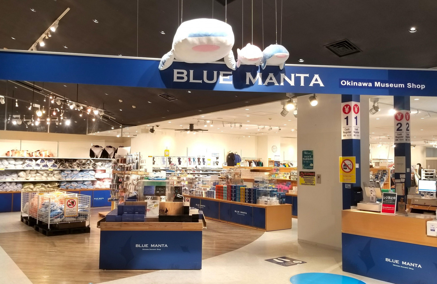 おみやげ探しもおすすめ。美ら海プラザにあるショップ「ブルーマンタ」(写真)には、水族館オリジナルグッズが豊富に揃う。なかでも人気なのは、ジンベエザメ関連の商品だ。ぬいぐるみやトートバッグ、Tシャツやお菓子など、ここにしかない商品は見るだけでも楽しい。きっとお気に入りが見つかるはずだ。