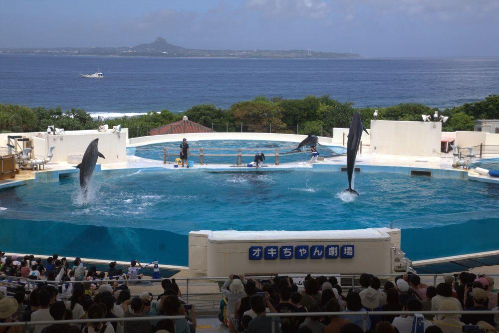 子どもたちに大人気なのが「オキちゃん劇場」で、コバルトブルーの海をバックに躍動するイルカに歓声があがる(写真)。ここで活躍するミナミバンドウイルカのオキちゃん(※1)とムクは、なんと今年で飼育50年。世界最長飼育記録を更新中だ。