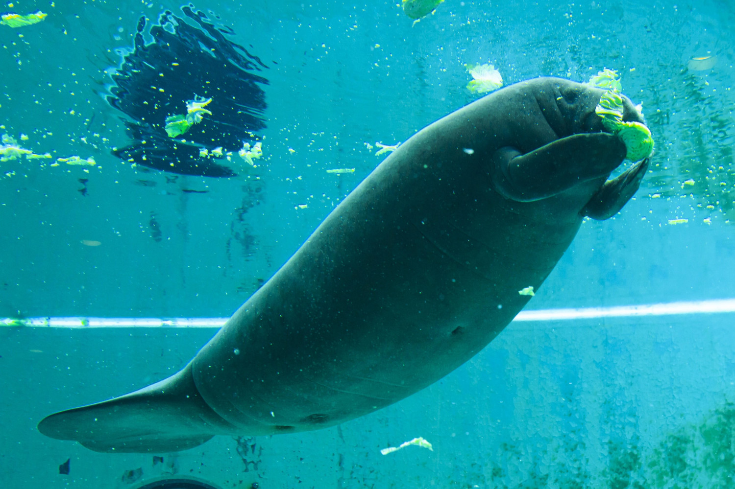 ウミガメ館にはアオウミガメ、アカウミガメをはじめ、日本では珍しいクロウミガメ、ヒメウミガメも展示されている。人魚のモデルともいわれるアメリカマナティー(写真)はかわいくて、見ているだけでほっこりする。