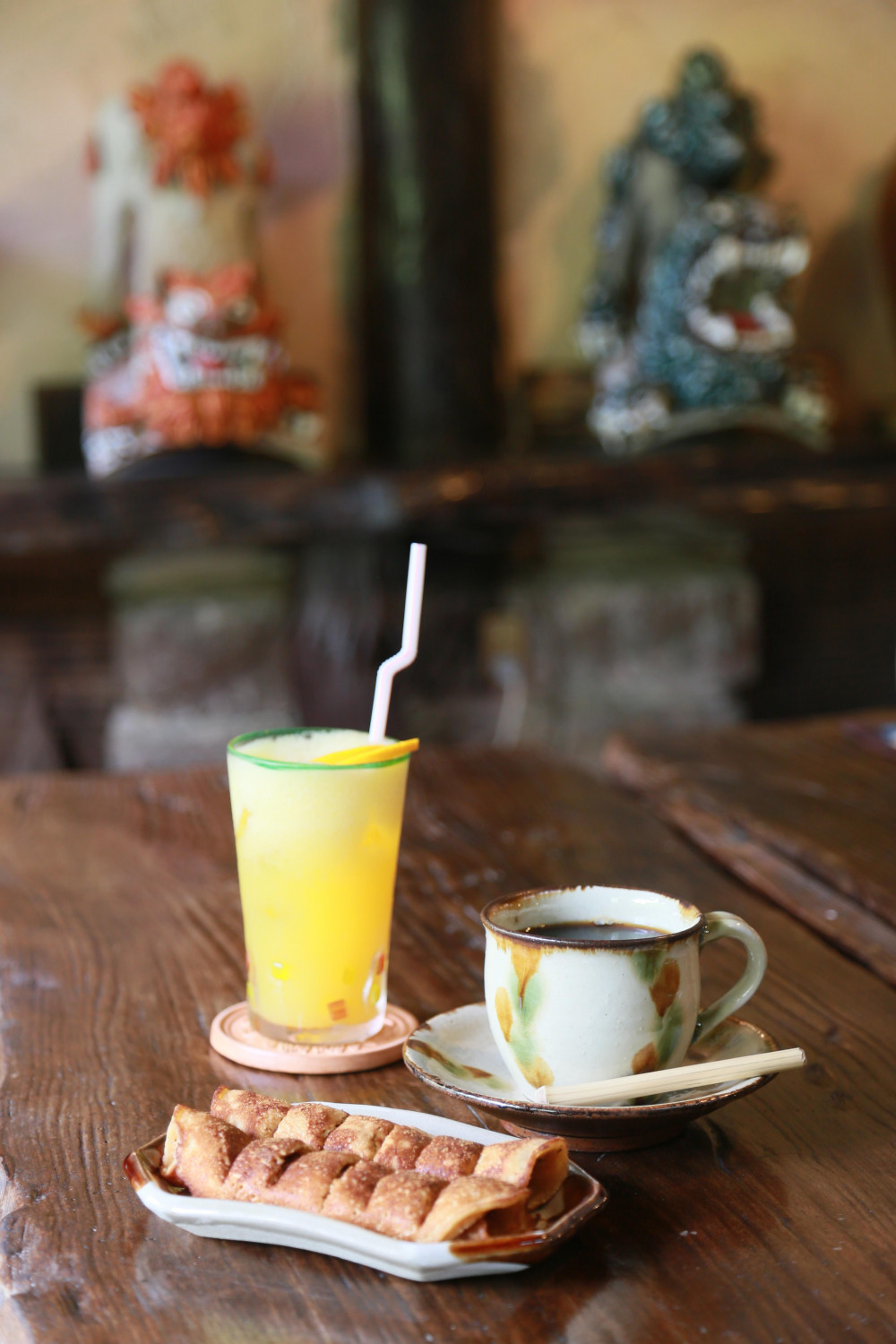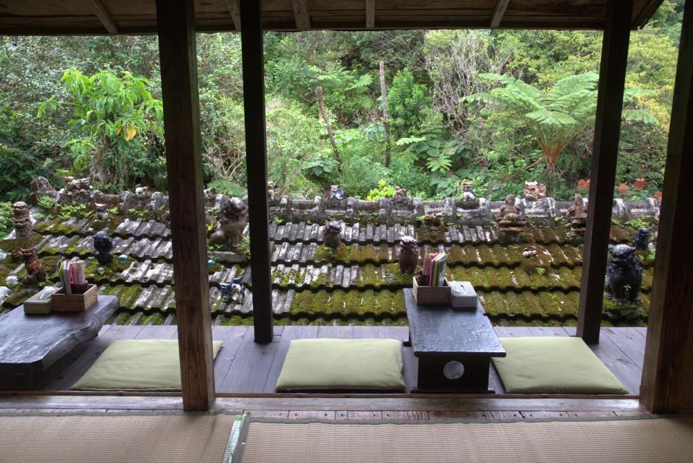 本部半島のカフェのなかで、老舗のひとつが「やちむん喫茶シーサー園」(写真)。やちむん(焼き物)好きだった先代のオーナーが、山歩きを楽しむ人がコーヒーを飲んで休める場所をつくりたいと、36年前に始めた店だ。2階に上がると、屋根に鎮座したシーサーたちが迎えてくれる(写真)。森の木々を揺らして風が通り、座敷のなかに蝶やトンボが飛んでくる。澄んだ空気に包まれた隠れ家のようなカフェだ。