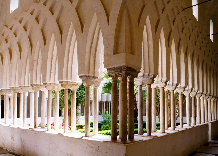 アマルフィ海岸の中心都市・アマルフィは、南イタリアとレヴァント(東地中海沿岸地方)の交易の中心地として繁栄。839年に共和国としてナポリ王国から独立し、10世紀半ばにアマルフィ公国を建国すると、中世の四大海洋都市(アマルフィ、ベネチア、ピサ、ジェノヴァ)のなかでも最初に発展し、ティレニア海に君臨した。大規模な造船所での造船や、航海術の革新をもたらしたヨーロッパ初の磁気羅針盤の開発、アマルフィ海法の制定など、アマルフィが海の世界に残した足跡は大きい。10世紀ごろに創建された「ドゥオーモ」(写真)は、アマルフィの栄華を物語る壮麗な建築。その北側に13世紀に建設された、アラブの楽園の雰囲気を漂わせる墓地「天国の回廊」(写真)など、地中海貿易によりイスラーム文化の影響を受けた建築がいまも残る。12世紀のピサによる侵略、14世紀の地震による津波被害などによりアマルフィは衰退してしまうが、いまも町を歩けば、羅針盤をモチーフにした装飾や市役所の外壁に描かれた四大海洋都市の紋章など、海洋貿易の拠点として栄えたころの面影を見つけることができる。