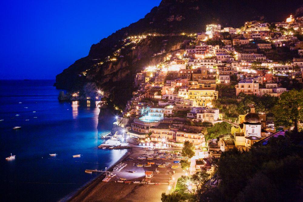 アマルフィ海岸随一の景観の美しさで人気のリゾートが、ポジターノ(冒頭写真)。紺碧の海沿いの急斜面の段丘に、カラフルな家々が連なる風景は、多くの文化人を魅了し、小説や映画の舞台となってきた。「ポジターノ風ファッション(モーダ・ポジタネーゼ)」として1960年代ごろに流行したリゾートファッションの店や、革の手作りサンダルの店などに立ち寄りながら、急な階段と石畳が続く旧市街の白い路地をそぞろ歩くのも楽しい。陽光降り注ぐ昼の風景も美しいが、家々に明かりが点る夜の町(写真)は、幻想的。また、アマルフィやサレルノから船で向かい、洋上から眺める町のドラマチックな表情も印象的だ。