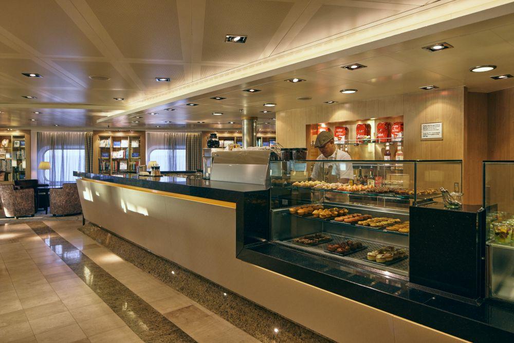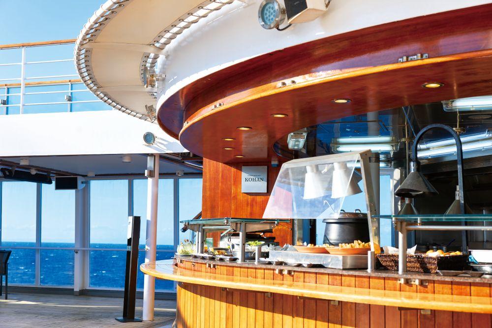 寄港地観光ツアー後にひと休みしたり、朝のコーヒータイムをゆっくり過ごしたり……と、何かと使い勝手のよいカフェスペース。今回の取材でも、MITSUI OCEAN スクエア内の図書コーナーで船や旅に関する書籍を読むときや、デッキ7後方のテラスでくつろぐときなど、クルーズ中は何度もカフェスペースを訪れて、心地よいひとときを過ごせた。