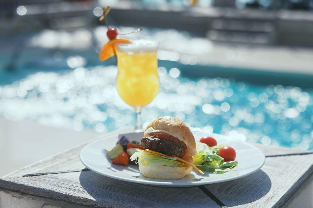 青空の下で、海風を感じながらプールやジェットバスを楽しみ、デッキチェアなどでくつろげるデッキ8中央はリゾートテイストたっぷりで、クルーズ中は多くのゲストが訪れる。そんなエリアにあるオープンエアーな食事スポット「プールサイドレストラン&バー 湖畔」(写真)は、湖のほとりでのリラックスしたピクニックシーンから着想を得て、日本や世界各地の料理にインスピレーションを受けたメニューが揃う。ミニサイズで食べやすいハンバーガー(写真)、ピザやパスタ、日替わりのメニューなどを気軽にオーダーでき、ときにはラーメンまでラインアップ! アルコール類も豊富なので、色とりどりのカクテルとともにデッキチェアで味わえば、リゾート気分がぐっと高まるはず。洋上の風景を眺めながらの昼食や、カジュアルに軽食やおやつを楽しみたいときにおすすめだ。(一部、別料金が必要なメニューあり)