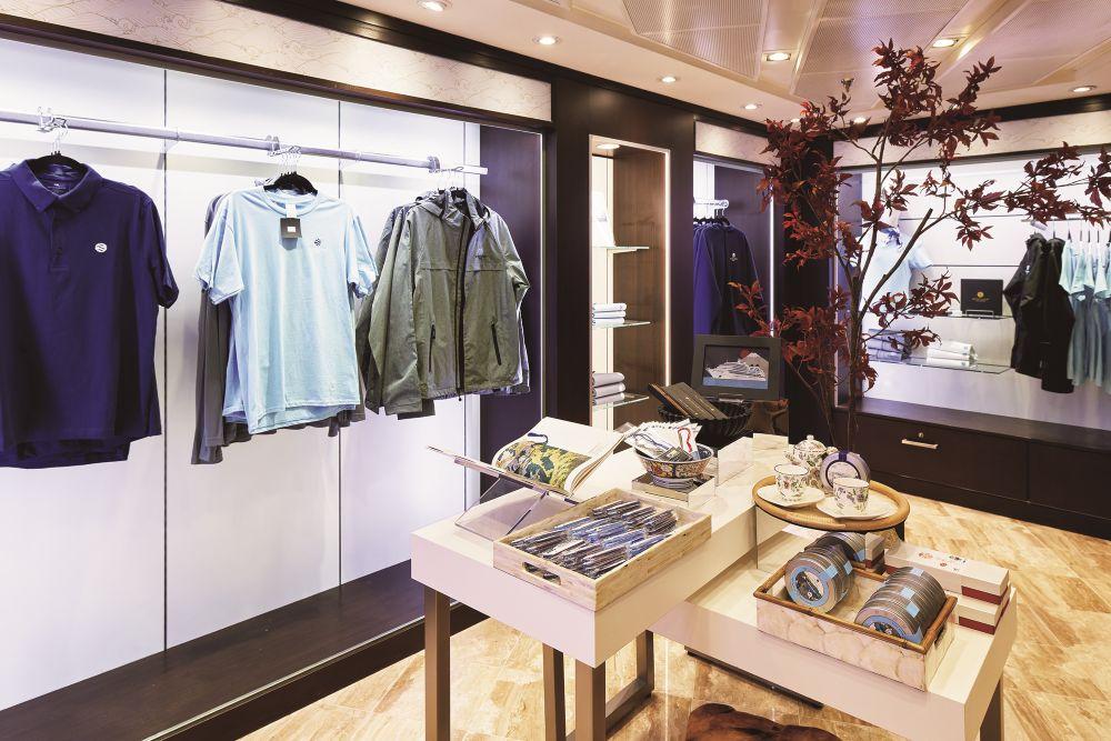 MITSUI OCEAN スクエアに隣接し、海外ブランドの衣料品を中心に、香水や化粧品、アクセサリー、雑貨、日用品など、こだわりがぎゅっと詰まったアイテムを揃えているのが「オーシャンブティック」(写真)。ちょっとした小物の買い忘れがあったときにも重宝する場所だ。なかでも、三井オーシャンフジのロゴが入ったオリジナルアイテムは要チェック! クランチチョコレートなどのお菓子、マグカップ、ノートや付箋などの文具、ハンカチなども販売している。乗船記念に購入して、自宅で船旅の余韻を楽しむのもいい。なお、オーシャンブティックの営業時間はクルーズ中に変動するため、船内新聞「PORT&STARBOARD」をチェックしてから訪問しよう。