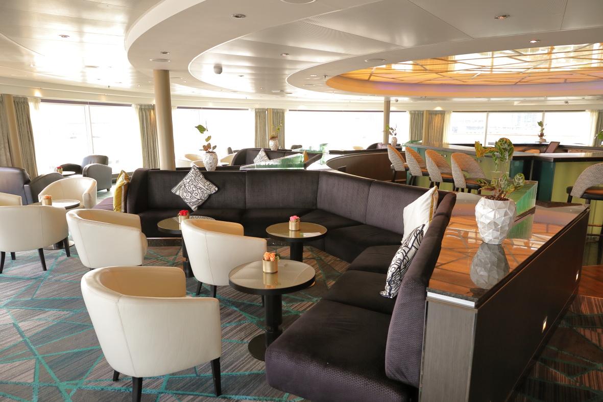 デッキ10にある「オブザーベーションバー 36[サンロク]」は、葛飾北斎の名作『冨嶽三十六景』の美しさをたたえて名づけられたバー(写真)。アーティストによるピアノ演奏や歌声をBGMに、落ち着いた夜のひとときを過ごせる。レストランや施設の多くは船の後方や中央に位置するが、オブザーベーションバー 36があるのは船首側。昼間、または夕方のオープンのころには、まるで船長になったような気分でパノラマの大海原が眺められる。