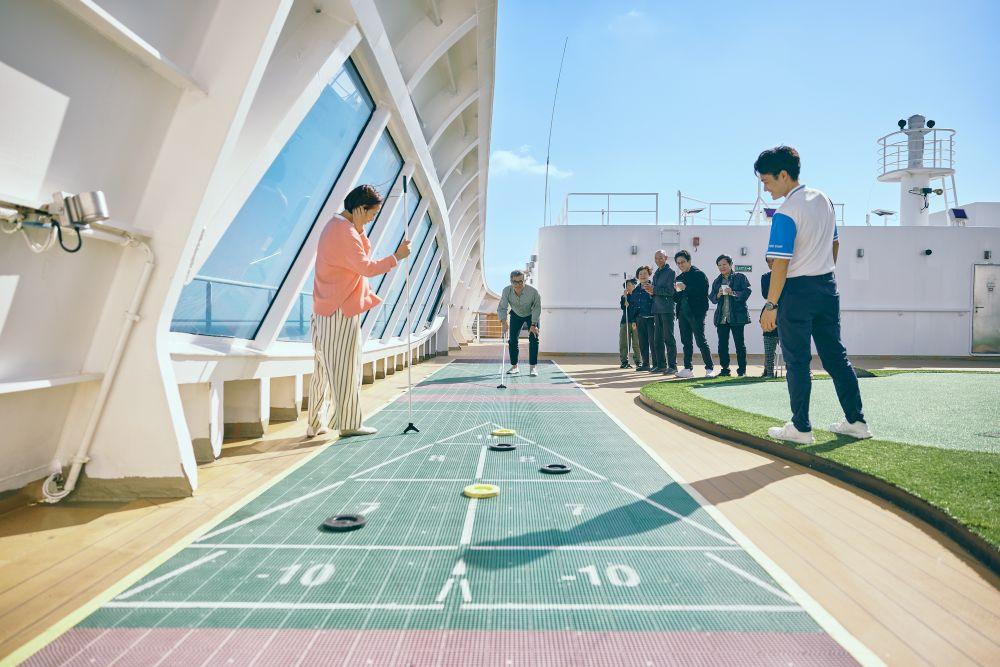 例えば、最上階・デッキ11の前方、オープンエアーの「アクティビティエリア来光」で行われるシャッフルボード大会(写真)。15世紀にイギリスの船乗りたちが甲板で過ごした際のレクリエーションが起源ともいわれるシャッフルボードは、細長いコート上でディスク(円盤)をスティック状のキューで押し出し、ダイアグラムと呼ばれる三角形の得点エリアに入れ、その得点を競う。初めてでもすぐに楽しめるゲームに、チームに分かれた参加者は一喜一憂の大盛り上がり!