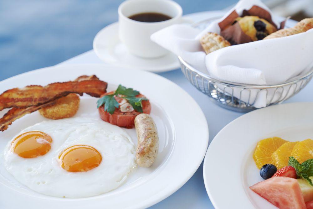 のんびりと過ごしたい朝には、ルームサービスを利用するのもよい。せっかくの船旅ということで、料理はバルコニーに運んでもらうことにした。船が進む波音と潮風が心地よく、海を眺めながら味わう朝食(写真)は格別だ。