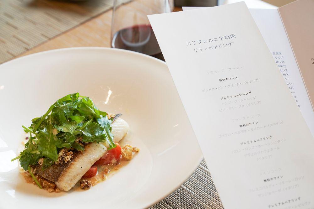 ディナーは「ザ・シェフズ・テーブル」でカリフォルニア料理(写真)を堪能。アミューズから始まり、クラブケーキ、口直しのグラニータ、白身魚のソテーと続き、デザートで締めくくる。ワインのペアリングも楽しみ、大満足の時間を過ごした。