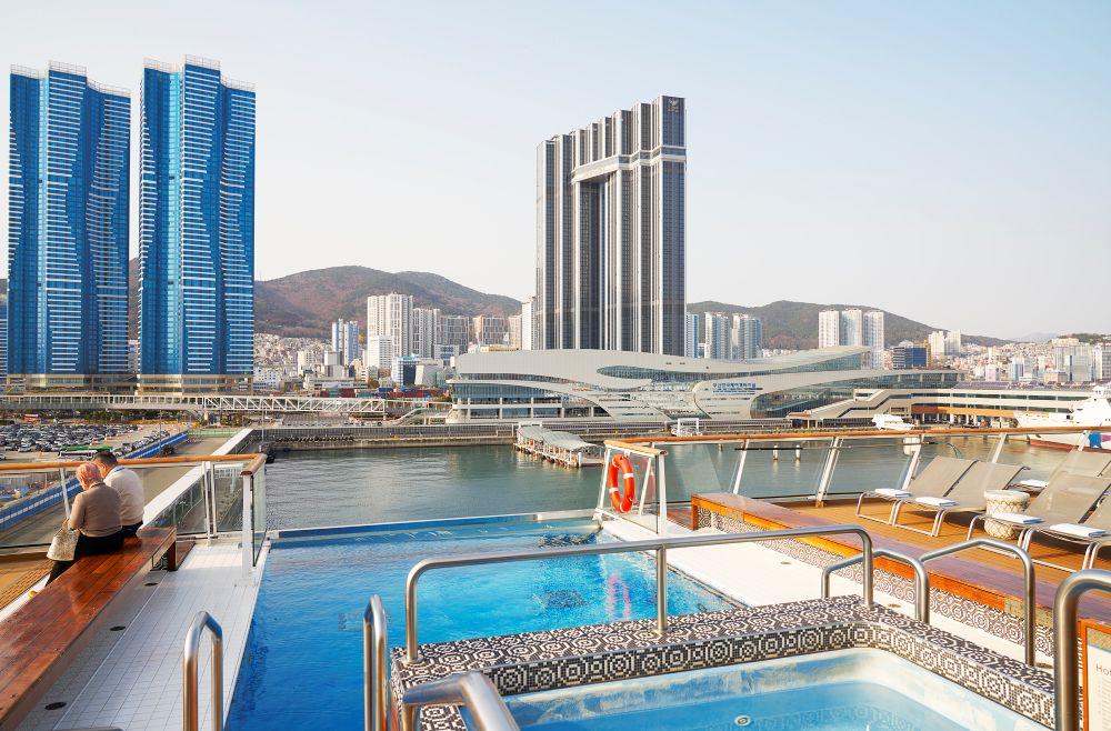 朝7時ごろ、船は静かに海外の寄港地である韓国の釜山に入港した。前衛的なビルが立ち並ぶ景色(写真)を眺めながらメインダイニングの「ザ・レストラン」へ向かい、和朝食セットを選択。外国籍ではあるものの、この船では日本食にも力を入れている。ご飯に味噌汁、焼き塩鮭や卵焼きなど慣れ親しんだ味わいに朝からほっこり。日本食を担当しているシェフの曽木善治(そぎよしはる)氏は、「だしは昆布とカツオでとっています。1週間か10日くらいのクルーズで胃袋が疲れないよう、塩分は控えめにし、少し薄めの味付けを心がけています」と語る。優しい味わいながら、だしがしっかり利いたひじきの煮物などは、ご飯のお供にぴったりだった。