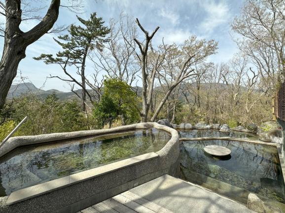 宿には露天風呂と大浴場、貸切風呂もあり、湯巡りができます。冒頭写真は、山照別邸にある源泉かけ流しのパノラマ露天風呂「薫風(くんぷう)の湯」。本館の内湯(写真)はぬるめと熱めの湯船があり、空いていれば貸切風呂(写真)も無料(宿泊者のみ)で入れます。