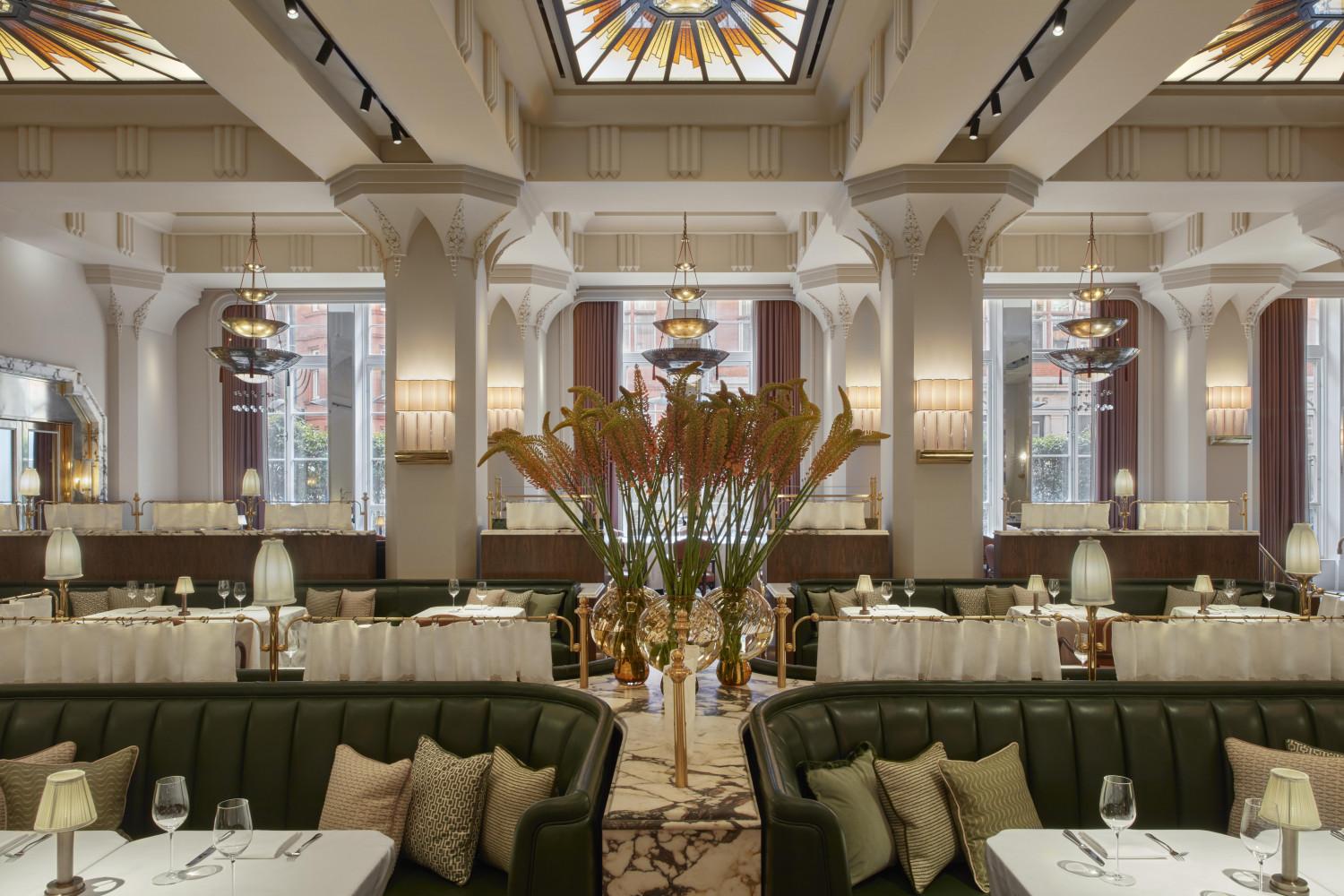 ロンドン万博のパビリオンを模した駅のデザインは流麗なラインが際立ち、現在も数々のドラマの背景として活用されている。駅から南へ30分ほど歩くと、上質なものが大好きなパディントンが目を輝かせそうなメイフェア地区に到着。クラシカルな魅力が詰まった街では、百貨店「セルフリッジズ」を訪ねたり、王室御用達のホテル「クラリッジズ」のレストラン(写真)やカフェでひと休みしたいところ。