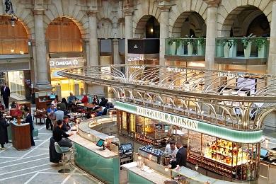 ロンドン広しといえども、プラットフォームがテムズ川の橋の上にある鉄道駅は「ブラックフライヤーズ駅」(写真)のみだ。中世のドミニコ会修道士の黒衣(ブラックフライヤー)が駅名の由来で、その権力の強大さが伝わってくる。「セント・ポール大聖堂」や元証券取引所を改装したモール(写真)など、重厚な建造物の迫力を感じつつ、金融街「シティ」を抜けて中心部に向かおう。